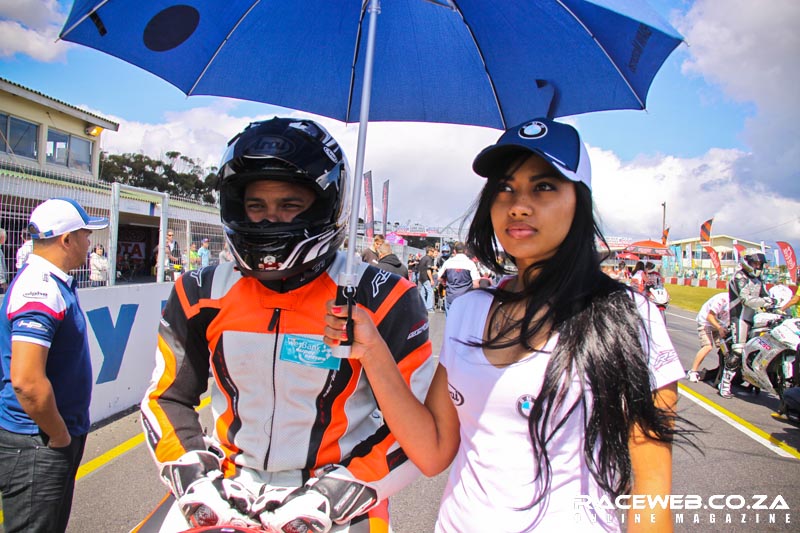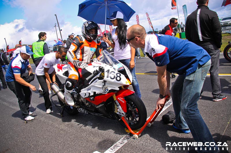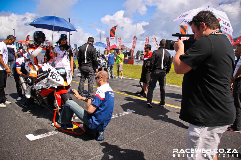 starting grid. Stands on, bike up, tyre warmers on, umbrella
